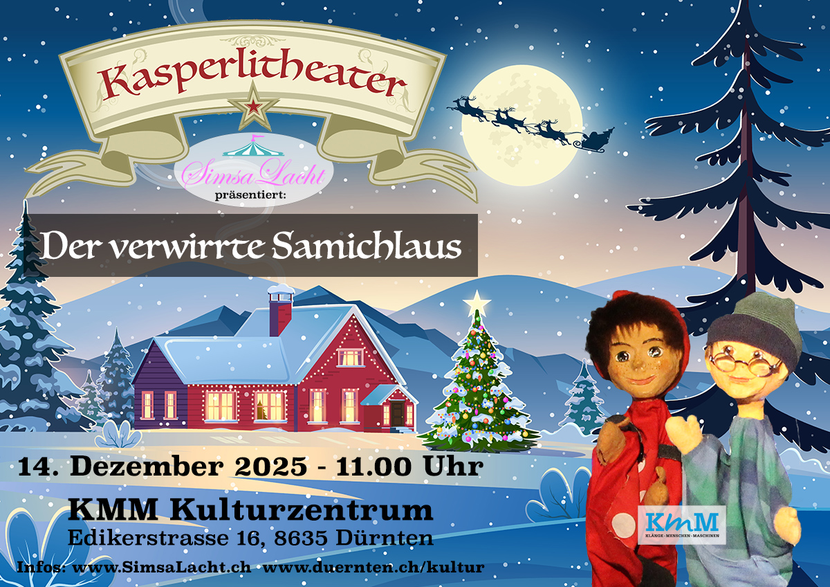 SimsaLacht präsentiert am 14. Dezember 2025 im KMM Kulturzentrum Dürnten das Stück «Der verwirrte Samichlaus». Ein vorweihnächtliches Kasperlitheater voller Spannung, Musik und Emotionen!
